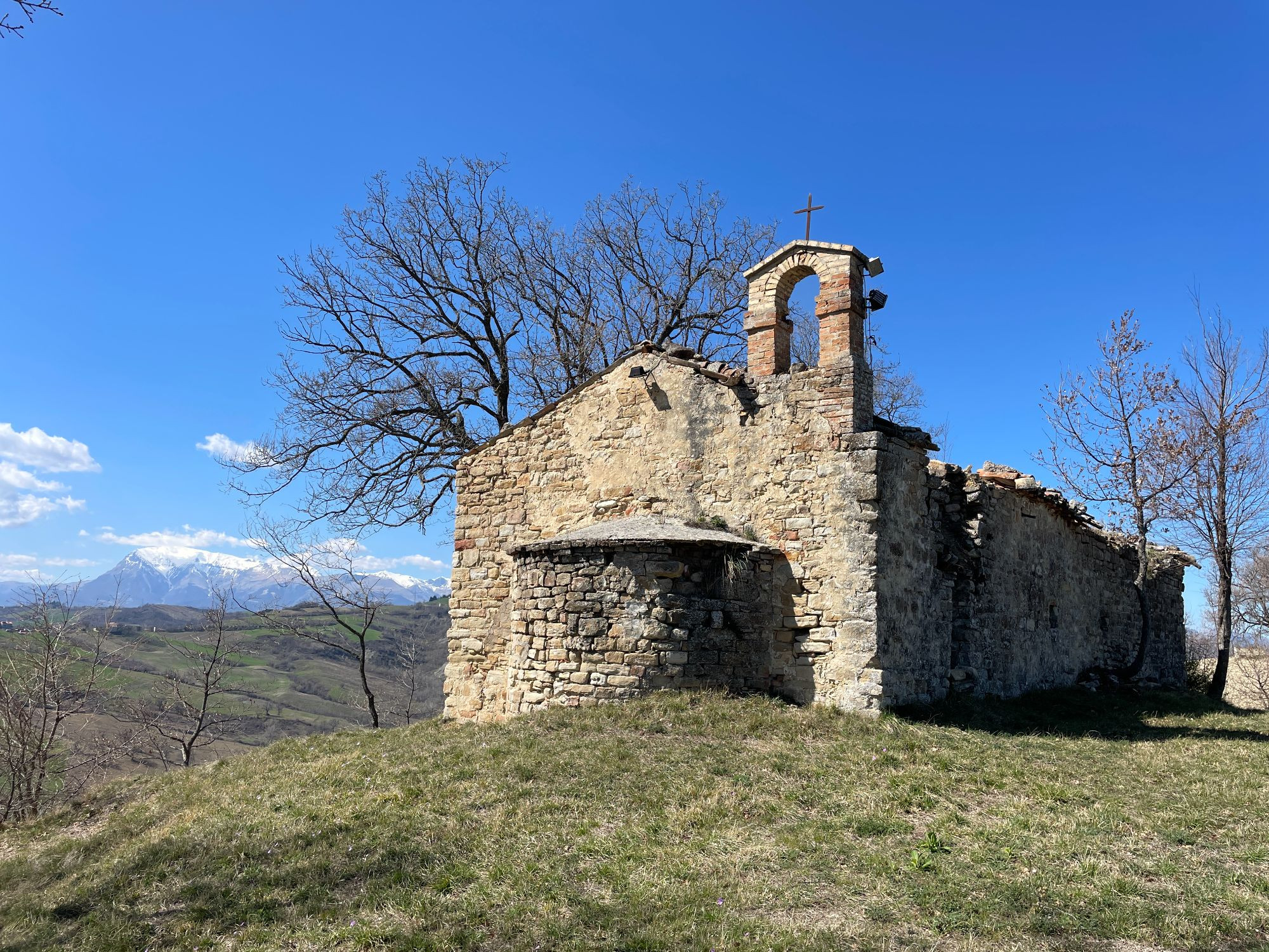 Wir verlassen das Dorf Rotella und nehmen die ersten anderthalb Kilometer eines anspruchsvollen Anstiegs in Angriff, der uns auf die Contrada Colle führt, eine lange unbefestigte Straße, die sich sanft über einen Hügelkamm schlängelt und einen herrlichen Blick auf die Sibillini-Berge und Valdaso bietet. Während wir in die Pedale treten, zeichnet sich der Umriss des Dorfes Force, unseres Ziels, vor uns ab. Zuvor jedoch (etwa bei Kilometer 8 nach dem Start) empfehlen wir einen kurzen Abstecher nach links, um zu den faszinierenden Ruinen der Kirche San Taddeo zu gelangen, einem Ort, der wie aus der Zeit gefallen ist und von weitem vom Monte Vettore beobachtet wird.