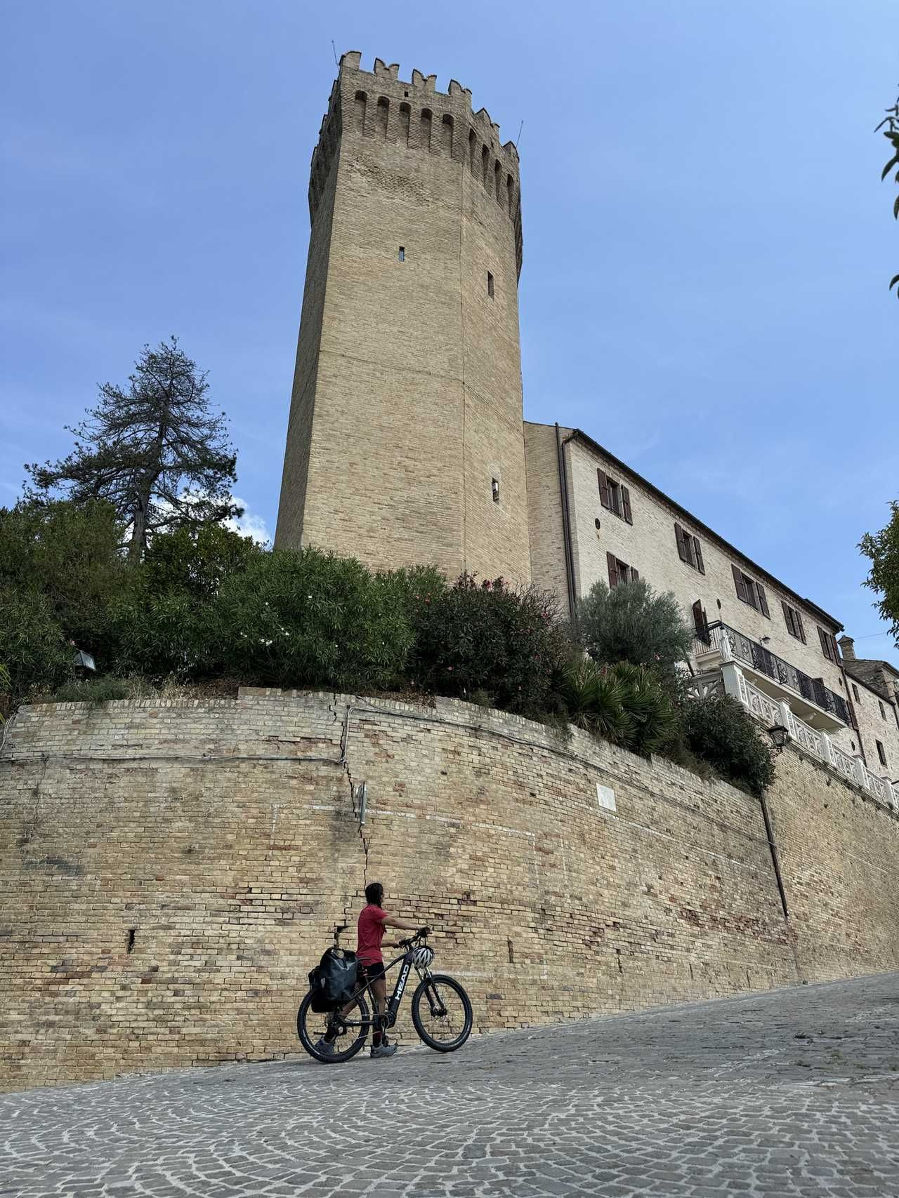 Von Altidona aus geht es auf den seitlichen Bergrücken, einen unbefestigten Weg, der den Verkehr umgeht und es uns ermöglicht, die unberührte Natur zu genießen, bevor wir kurz auf die Provinzstraße zurückkehren. Bald jedoch machen wir einen Abstecher nach Moresco, einem der schönsten Dörfer Italiens, mit seinem ikonischen siebeneckigen Turm und einem kleinen Platz, der in der Zeit zu schweben scheint. Die Route endet mit der Rückkehr ins nahe gelegene Monterubbiano, müde, aber zufrieden.